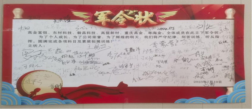 2023年7月10日,高金奮斗者干部管理學院李吉興院長親臨現場主持了開營儀式,在他的諄諄教誨中“以奮斗者為本,以創新者為尊”的核心價值觀深深的印在了大家的心上。隨后,同學們堅定立下了“為了個人成長,為了公司榮譽,為了輝煌的明天,我們將嚴守紀律,刻苦訓練,聽從指揮,圓滿完成各項科目及素質拓展訓練”的軍令狀。