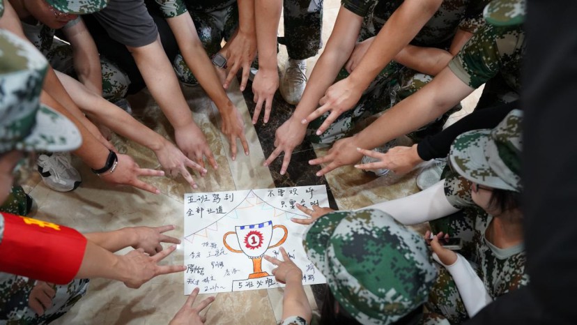 在專業教官們的帶領下,同學們分成了八個班級兩個中隊,通過“專注,投入”的團隊合作游戲,學員們選出了自己心目中值得托付的班長和中隊長,畫下了屬于自己團隊的愿景圖,洪亮的口號響徹整個會場。